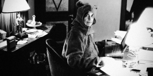 susan sontag'ın fotoğrafı. başkası görse çalışma moduna girebilmek için yaptığım bir absürdlük olduğunu sanabileceği aklıma gelmeden, ofiste üşüdüğüm için avukat cübbesi giyip çalıştığım, patronun odaya girip o halimi görünce kilitlendiği akşamı hatırlattı. önünden arkasından soyutlanmakla absürd, kitsch, etrafıyla uyumsuz, saçma hale gelen imgelere karşı boş değilim. ![]() | ||